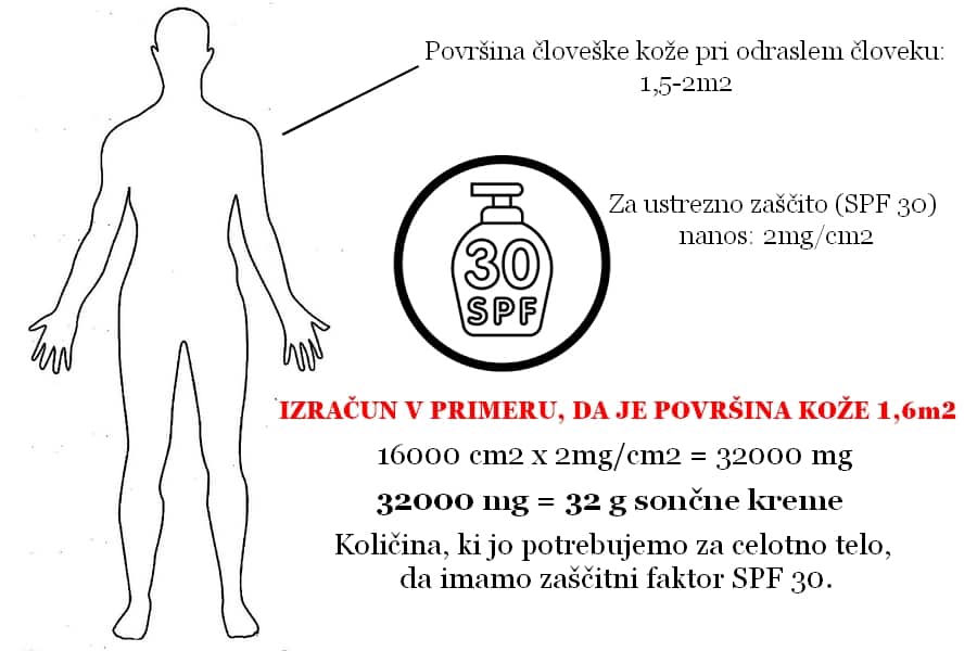 Pridemo do rezultata 32 g na en nanos. Za ustrezno zaščito celotnega telesa bi torej morali porabiti 1/3 celotne 100 ml tube sončne kreme. Pri tem še seveda nismo upoštevali, da je sončno kremo potrebno ponovno nanesti vsaki 2 uri.